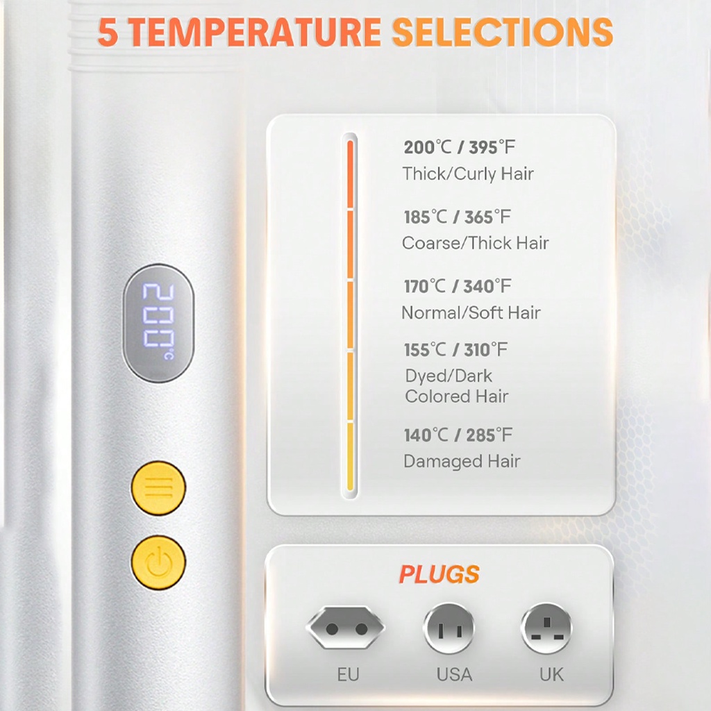 - پنج سطح دما از حدود ۱۶۰ تا ۲۰۰ درجه سانتیگراد، مناسب برای موهای نازک تا ضخیم