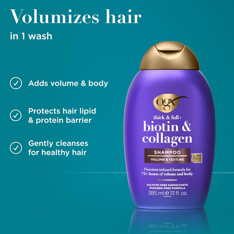 شامپو OGX Thick & Full + Biotin & Collagen یک شامپوی تخصصی برای افزایش حجم، ضخامت و استحکام موهای نازک و کمحجم است.