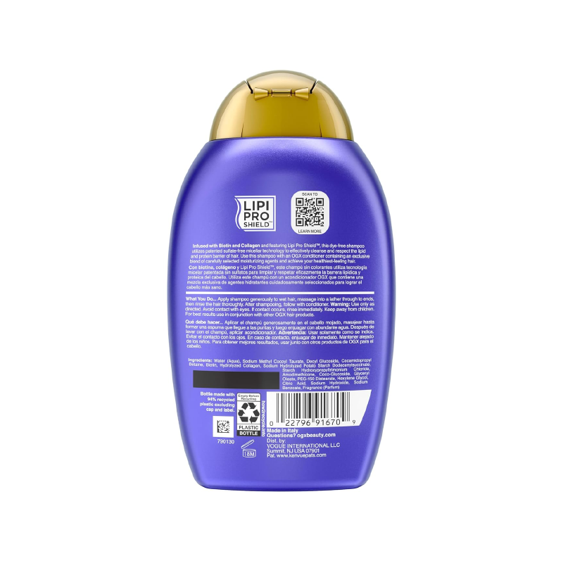 با استفاده منظم از شامپو OGX Biotin & Collagen، موها پرتر، ضخیمتر و خوشحالتتر به نظر میرسند.