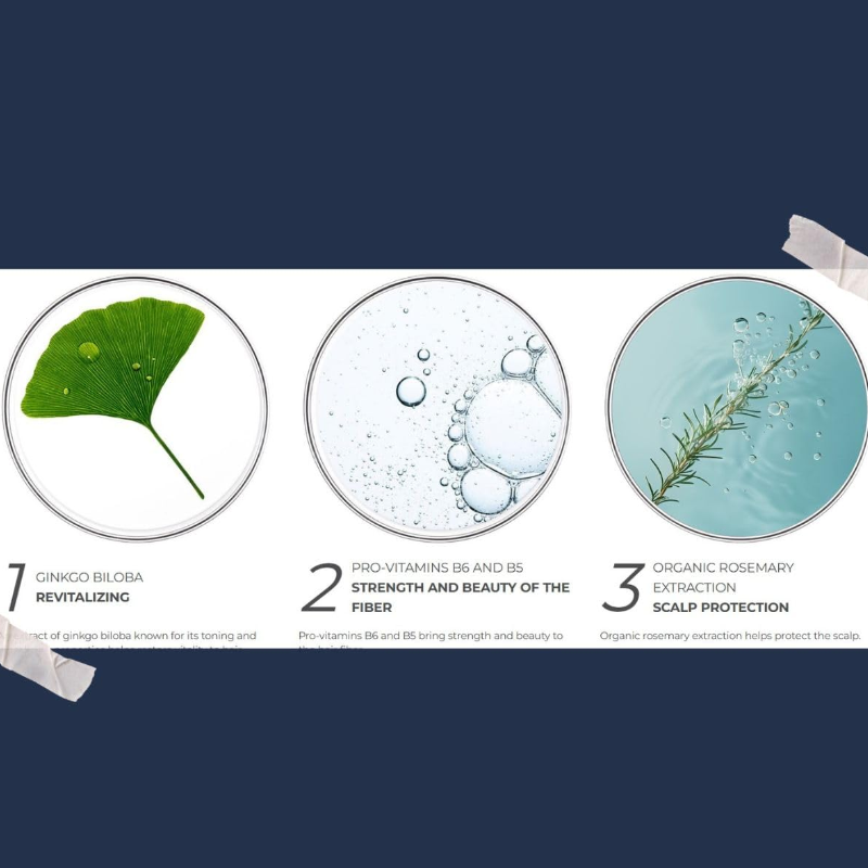 حاوی ترکیبات گیاهی غنی از عصاره انگور، جینکوبیلوبا، و پروتئینهای گیاهی است که به بهبود گردش خون پوست سر کمک کرده و رشد مو را تحریک میکند.