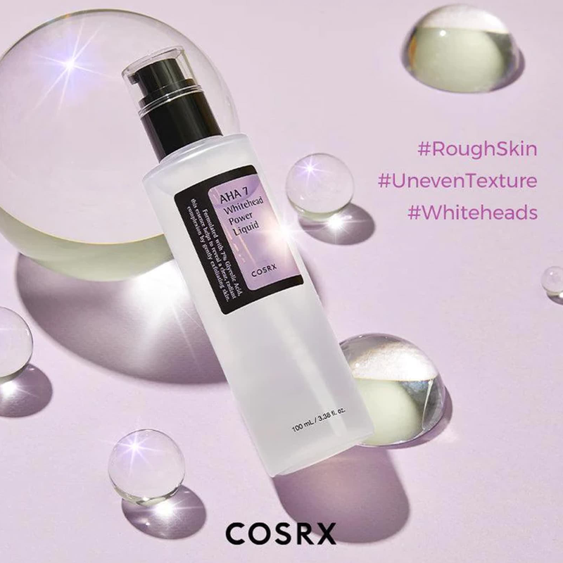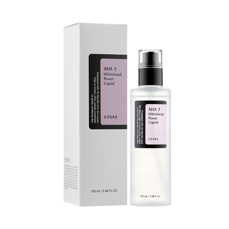 لیکویید AHA کوزارکس (COSRX AHA 7 Whitehead Power Liquid) – لایه‌بردار ملایم با ۷٪ اسید گلیکولیک و آب میوه سیب، مناسب برای حذف سلول‌های مرده، پاکسازی منافذ و کاهش جوش سر سفید. پوست را صاف‌تر، شفاف‌تر و یکدست‌تر می‌کند. استفاده ۱–۳ بار در هفته.