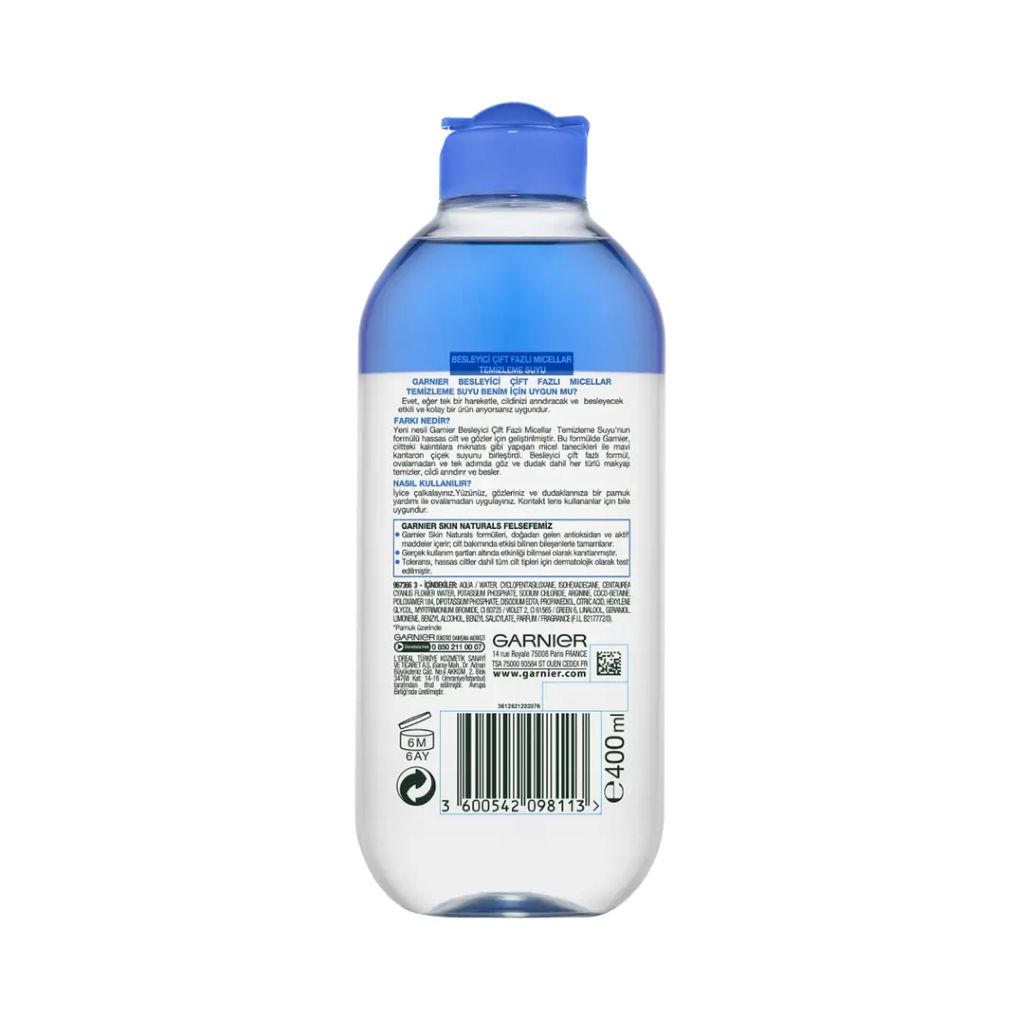 میسلار واتر دو فاز پوست حساس گارنیر، پاک‌کننده چربی، آرایش و آلودگی‌های مقاوم را به‌صورت ملایم و بدون کشیدگی پوست پاک می‌کند و با فرمول دو فاز، چشمان و لب‌ها را نیز به‌خوبی پاکسازی می‌نماید. مناسب پوست‌های حساس، حجم ۴۰۰ میلی‌لیتر.