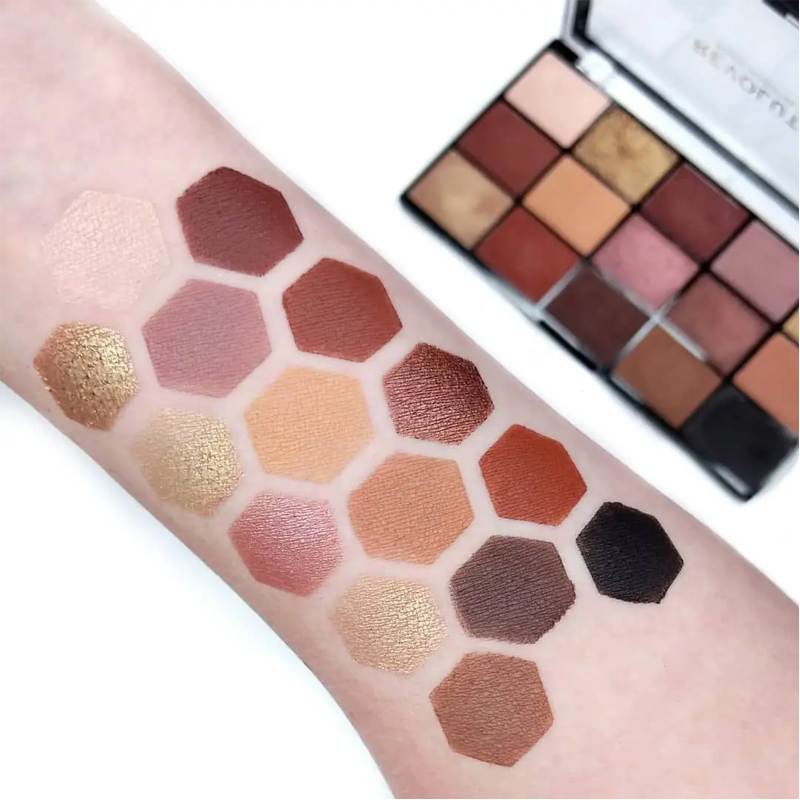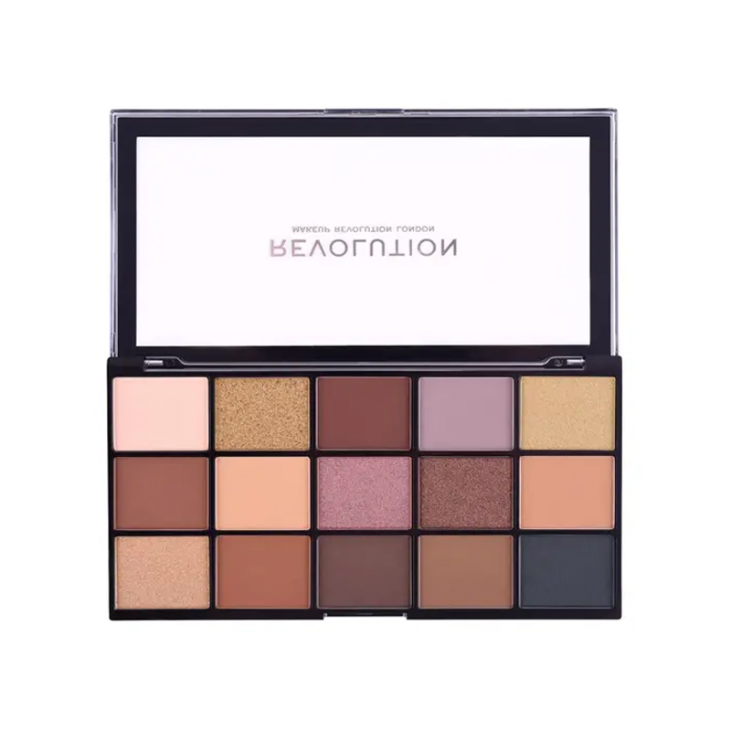 پالت سایه رولوشن ولوت رز از برند Revolution یکی از محبوبترین پالتهای ۱۵ رنگ با الهام از رنگهای گرم، شکلاتی و رزگلد است. این پالت ترکیبی از رنگهای مات، متالیک و شاین دارد و برای آرایشهای روزانه، اسموکی، مجلسی و گلام کاملاً مناسب است. بافت سایهها نرم، پیگمنت قوی و فید شدنشان بسیار راحت است. عرضه شده توسط ونوسان شاپ.