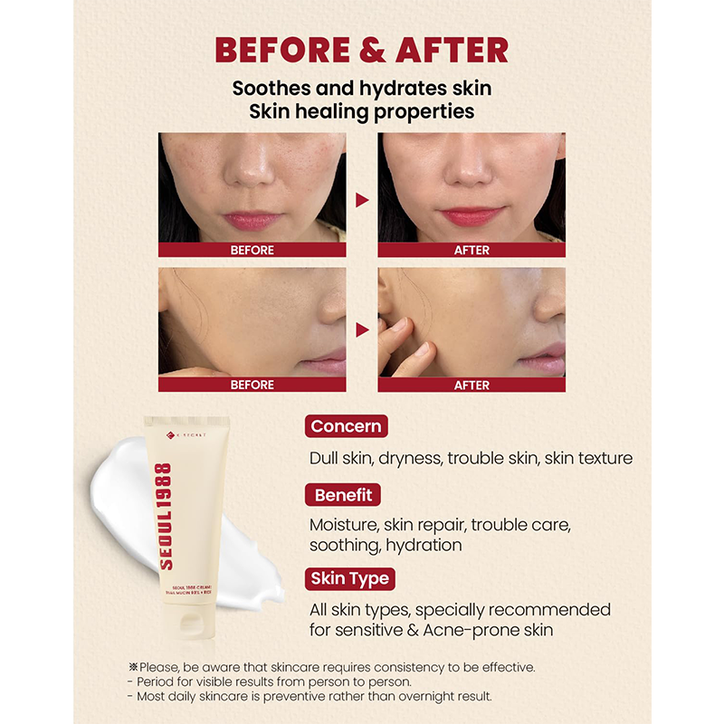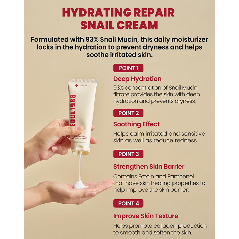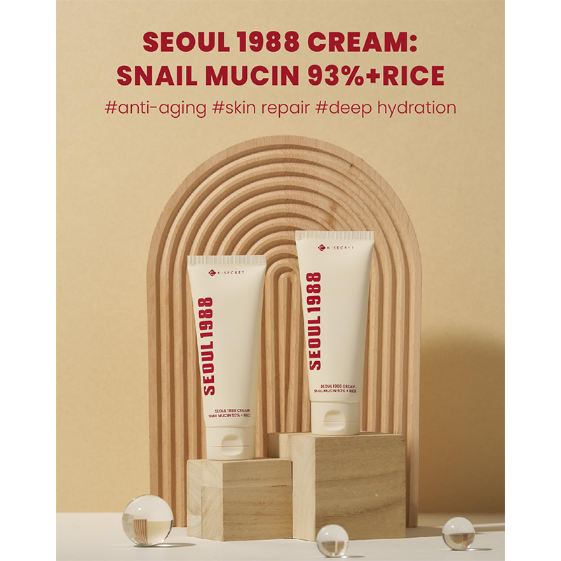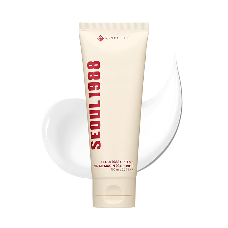 کرم مرطوب کننده و ترمیم کننده سئول 1988 Seoul 1988 Cream K-Secret با ۹۳٪ موسین حلزون و عصاره برنج، یک آبرسان قوی برای ترمیم بافت پوست، کاهش خشکی و التهاب و افزایش لطافت و شفافیت پوست است؛ مناسب برای پوست‌های حساس، خشک و دهیدراته برای استفاده‌ی روزانه.